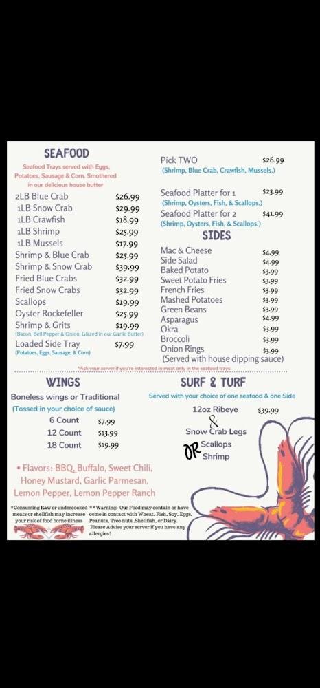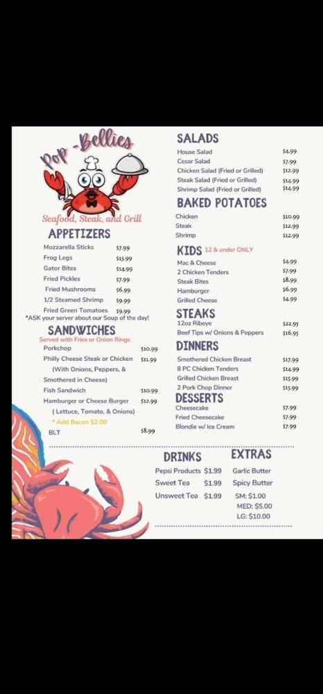 The menu at Pop Bellies is a delightful blend of flavors focusing on seafood and classic Southern dishes. From the wide array of seafood options, including crab legs and shrimp trays, the freshness stands out. Diners can also indulge in fully loaded baked potatoes topped with a choice of meats. Various salads and hearty sandwiches, such as the Philly cheese steak, round out the selection.